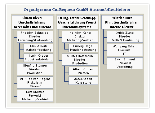 Die CarBequemGmbH (290 Mitarbeiter), ein Unternehmen mit 45-jähriger Tradition als Automobilzulieferer im Bereich Innenausstattung, hat aufgrund der Marktveränderungen in der Autobranche eine neue strategische Orientierung entwickelt. Unter dem Motto „Wir machen Ihr Auto greifbar!“ produziert die CarBequemGmbH Innenverkleidungen sowie verschiedene auf Komfort und Individualität gerichtete Accessoires und Zubehör für PKW mit Ausnahme der Sitze. Während die Produktion der Innenverkleidungen den strengen logistischen Anforderungen der Automobilproduzenten folgt und unter extremem Qualitäts- und Kostendruck steht, lässt sich das Geschäftsfeld „Accessoires und Zubehör“ auf das breite Publikum ausrichten und kreativ ausgestalten. Die seit wenigen Jahren amtierende neue Geschäftsführung hat Produktlinien wie Textilien, Sonnenschutz oder Bodenmatten konsequent gestrichen, um Rationalisierungseffekte zu erzielen. Allerdings sind aufgrund der angespannten Konjunktur erhebliche Ertragsprobleme zu bewältigen. Insbesondere die schwache Auslastung des kapitalintensiven Maschinenparks im Kunststoffbereich beeinträchtigt das operative Ergebnis der CarBequem, was zur Zeit gerade noch durch Lizenzgebühren auf früher erworbene Patente in den nicht mehr verfolgten Produktlinien aufgefangen wird.
